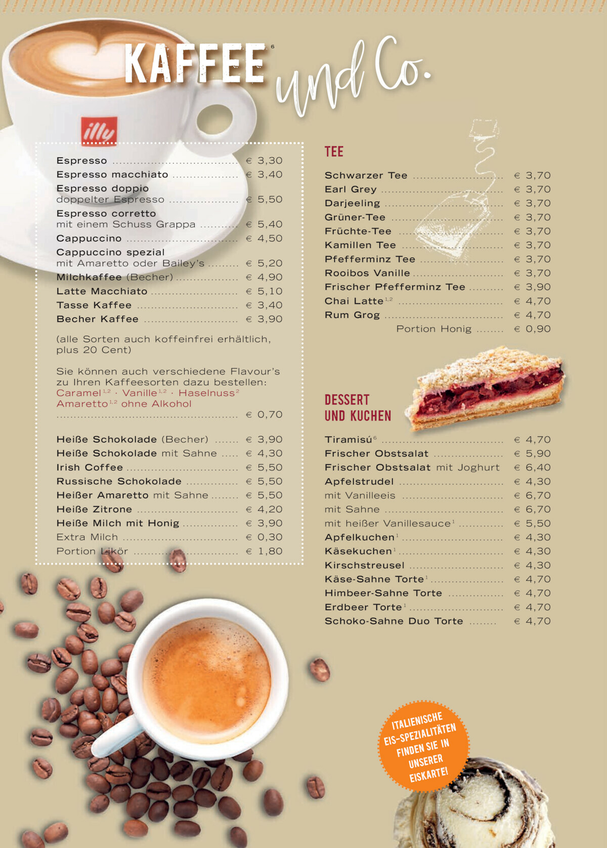 Zum Kaffee oder Tee können Sie sich von unserem hausgemachten Tiramisu oder einen unserer zahlreichen Kuchen verführen lassen – ganz ohne Reue.